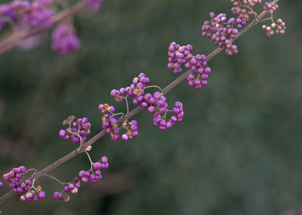 Japan House is where I developed my affection for Japanese Beautyberry (Callicarpa), a shrub whose tiny purple berries persist through the winter on thin arching stems.