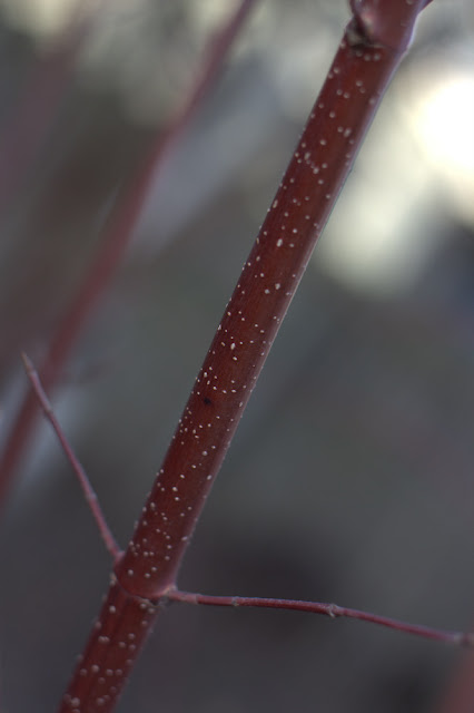 The bark of the red-twig dogwood (Cornus sericea) growing just inside the backyard garden gate is dotted with white lenticels along its length. This particular dogwood is susceptible to a variety of diseases as it ages, so I try to cut back any stems that get thicker than an inch. It's more than willing to grow new stems from the base after a hard pruning.