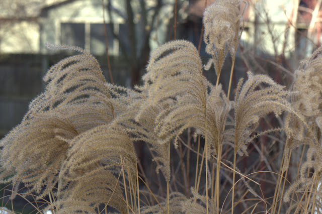 Just yesterday, I said my garden was depressing. Today, I feel like I owe it an apology. Early morning clouds have moved east, revealing a blue sky and a vibrant garden alive on a light breeze. The air is fresh and cool. The warm sun makes a jacket nearly superfluous.Breezy winter days are the one of the many reasons I love growing Miscanthus.While the breeze makes them a bit difficult to photograph, I like watching the seedheads dance in and out of the lens frame as I snap away. Every so often, I'll capture a crisp photo that still evokes the feeling of movement.