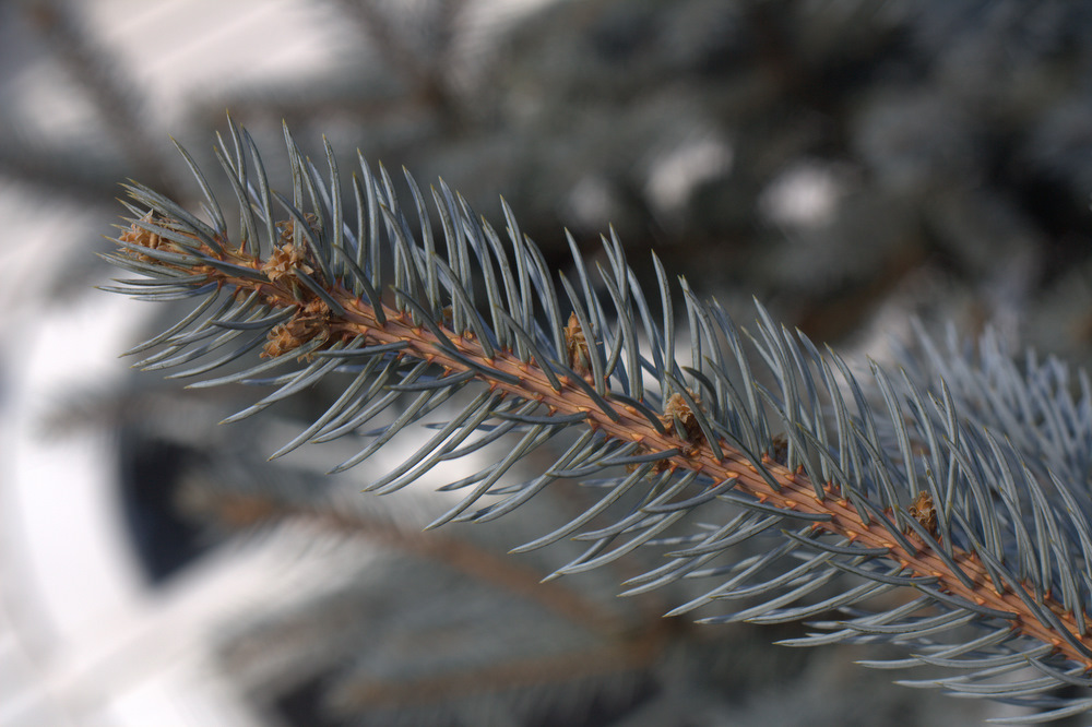 The blue spruce (Picea pungens 'Fat Albert') that anchors our front border shines in the morning sun. The contrast between the bronze stems and the blue foliage is among my favorite color combinations in the garden.