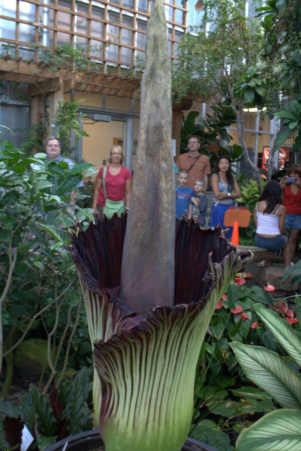 Last weekend, thousands of people walked through the University of Illinois Conservatory. Some of them traveled from hundreds of miles away. Most of them had never heard of the conservatory, much less paid it a visit. A video crew from Modern Marvels was also on hand. Why the sudden surge in popularity? It was all thanks to the long-awaited bloom of the Titan Arum (Amorphophallus titatum), popularly known as the corpse flower.As you might guess from the reaction of my son after he stuck his nose inside the bloom, it's called the corpse flower because at peak bloom it smells like rotting flesh.